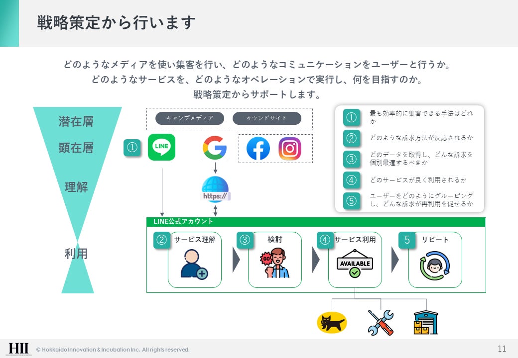 どのようなメディアを使い集客を行い、どのようなコミュニケーションをユーザーと行うか。、どのようなサービスを、どのようなオペレーションで実行し、何を目指すのか。