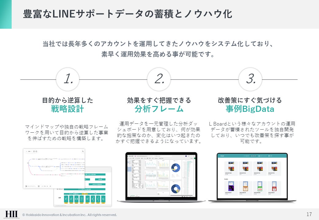当社では長く企業様向けにLINE運用をサポートしており、実績データをBigDataとして蓄積しているため、効果的な活用ノウハウを保持しています。