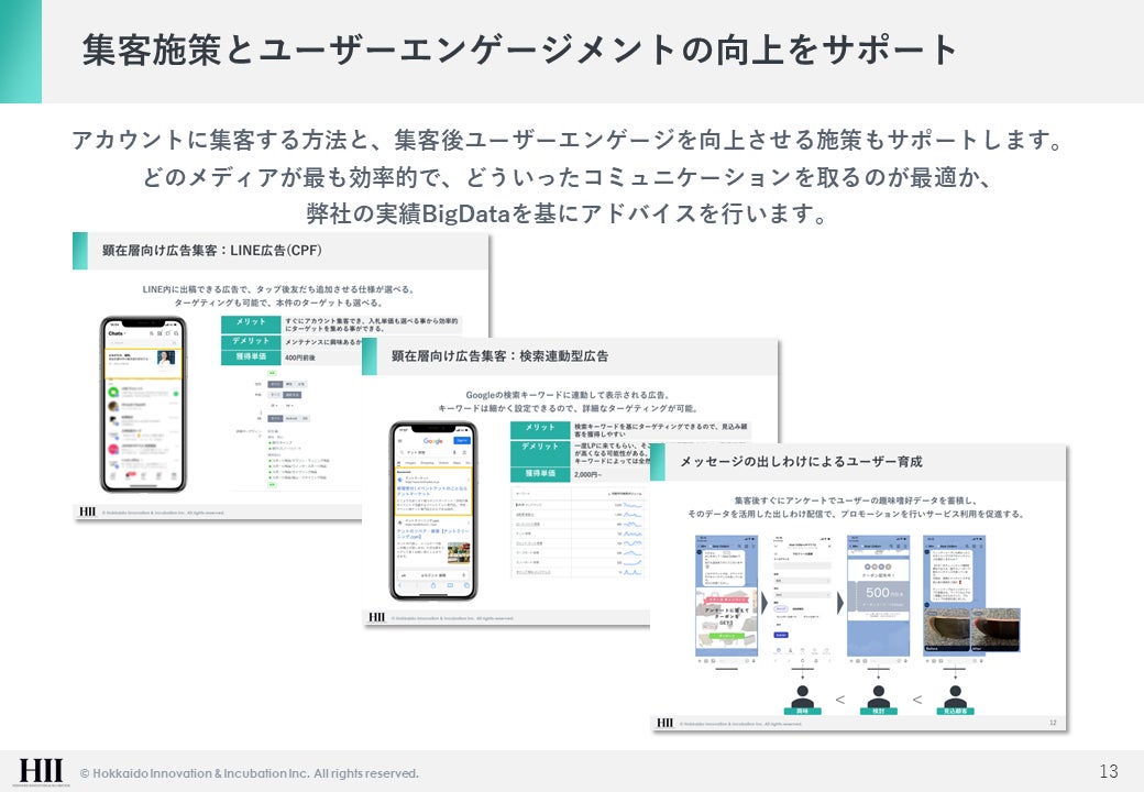 LINEアカウントに集客する方法と、集客後ユーザーエンゲージメントを向上させる施策もサポートします。